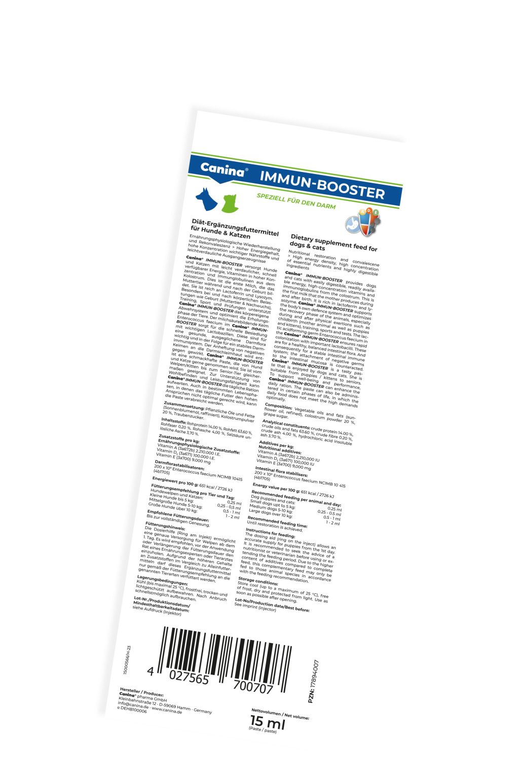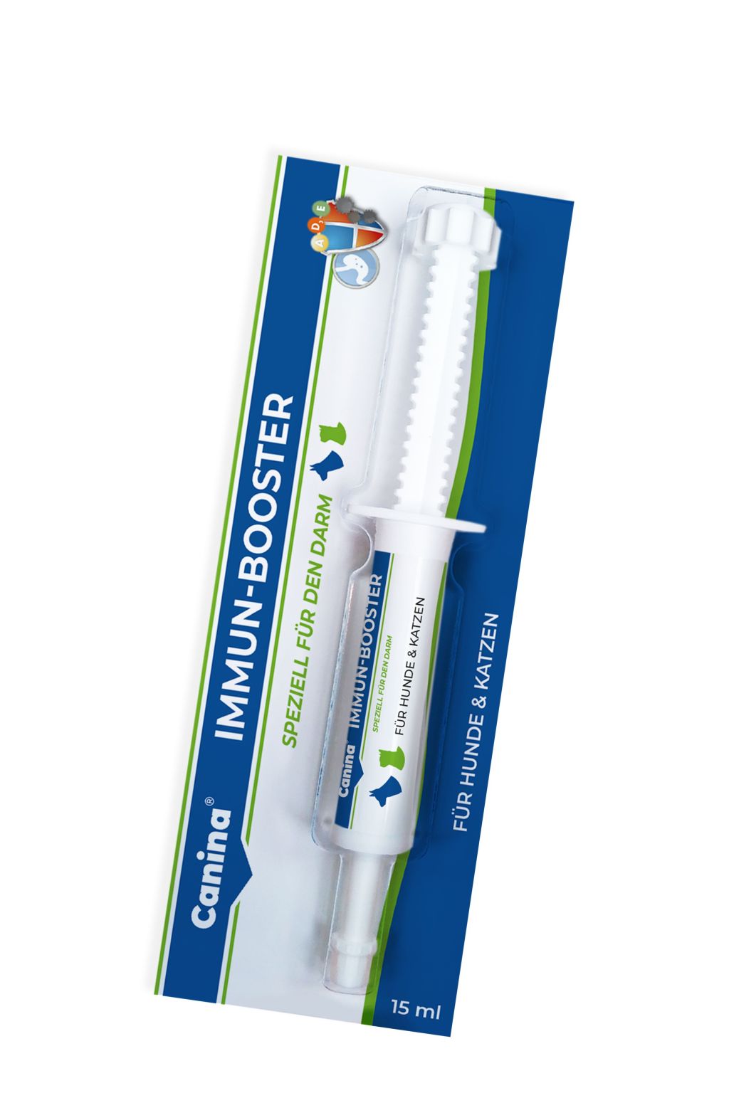 Canina® Immun Booster versorgt Hunde und Katzen mit leicht verdaulicher, schnell verfügbarer Energie, Vitaminen in hoher Konzentration und Immunglobulinen aus dem Kolostrum. Dies ist die erste Milch, die das Muttertier während und nach der Geburt bildet. Sie ist reich an Lactoferrin und Lysozym. Besonders bei und nach körperlichen Belastungen wie Geburt (Muttertier & Nachwuchs), Training, Sport und Prüfungen unterstützt Canina® Immun Booster das körpereigene Abwehrsystem und optimiert die Erholungsphase der Tiere. Der milchsäurebildende Keim Enterococcus faecium im Canina® Immun Booster sorgt für die schnelle Besiedlung mit wichtigen Lactobazillen. Diese sind für eine gesunde, ausgeglichene Darmflora wichtig und in der Folge für ein stabiles Darmimmunsystem. Der Anheftung von negativen Keimen an die Darmschleimhaut wird entgegengewirkt.