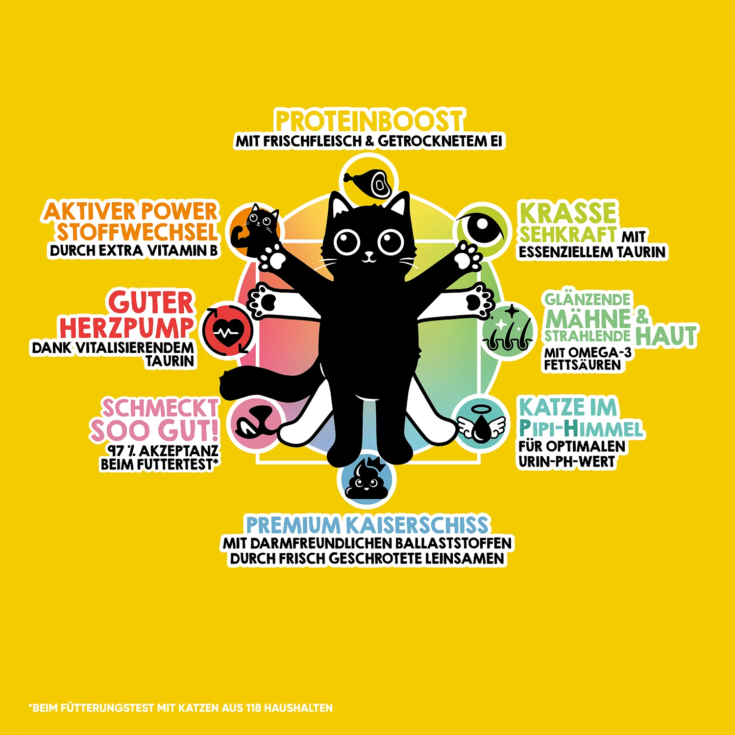 Omega-3- und Omega-6-Fettsäuren unterstützen Haut und Fell, während Taurin essenziell für Herz- und Augenfunktion ist. DL-Methionin kann zusätzlich die Harnwegsfunktion unterstützen.