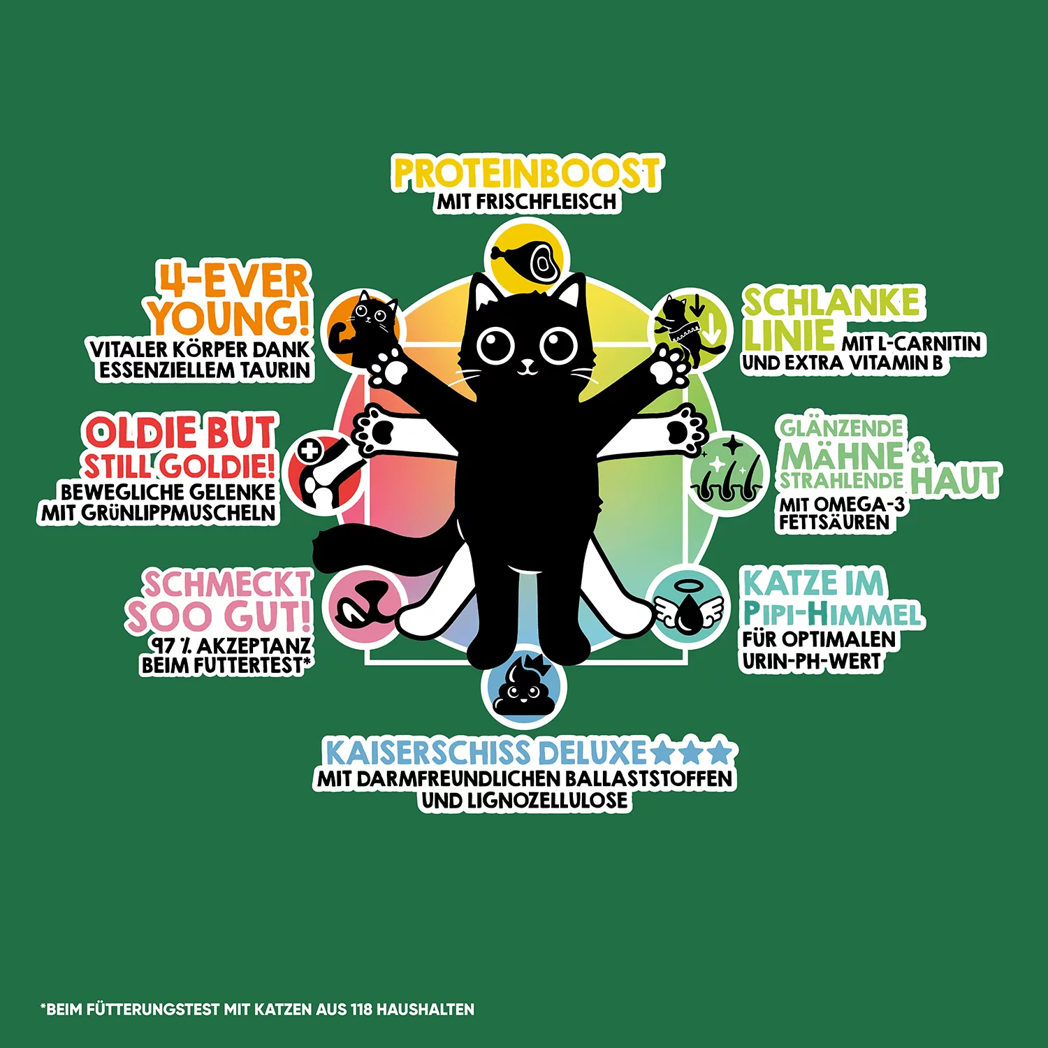Mit angepasstem Energiegehalt und hochwertigen Proteinen eignet sich dieses Alleinfuttermittel ideal für Katzen ab dem Seniorenalter.